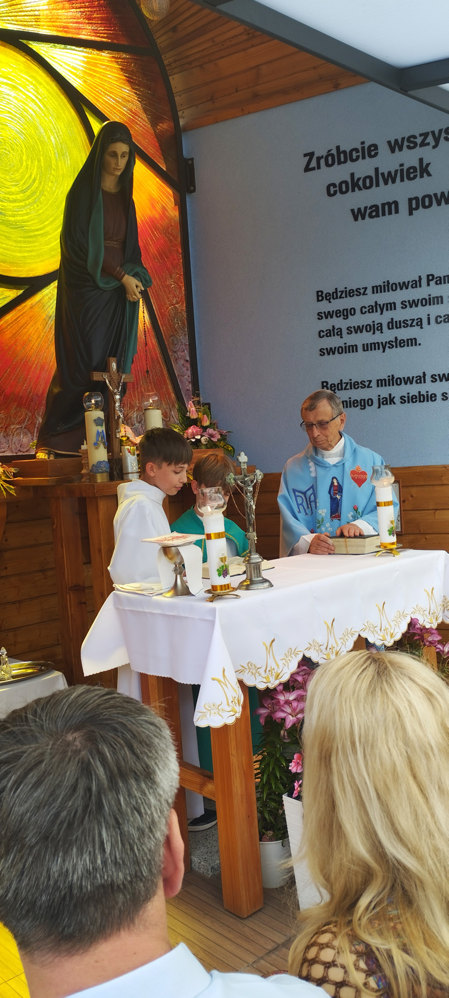 Pierwsze słowa Ojca: "jestem w cisownickiej katedrze". I przywitał nas po japońsku. Nasi ministranci i Pan Michał (syn Pani Teresy) czytali lekcje i modlitwę psalmów. W kazaniu Ojciec Jan nauczył nas, między innymi, jak czytać Pismo Święte i to własny, osobisty egzemplarz. Powiedział: "Pismo Święte trzeba spożywać, nie tylko czytać". Zademonstrował swój egzemplarz - bardzo wypracowany podkreśleniami i odnośnikami. Jest mi wstyd, że moje Pismo Święte (czytane już 20 lat) jest jak nowe. Przypomniał okres w historii Japonii, gdy bezwzględnie prześladowano i torturowano wyznawców Chrystusa. Teraz Japonia może być wzorem tolerancji religijnej. Powiedział też, że nie trzeba nawracać Japończyka, że my się powinniśmy nawracać doskonaląc nasze życie według danego nam słowa Pisma Świętego.